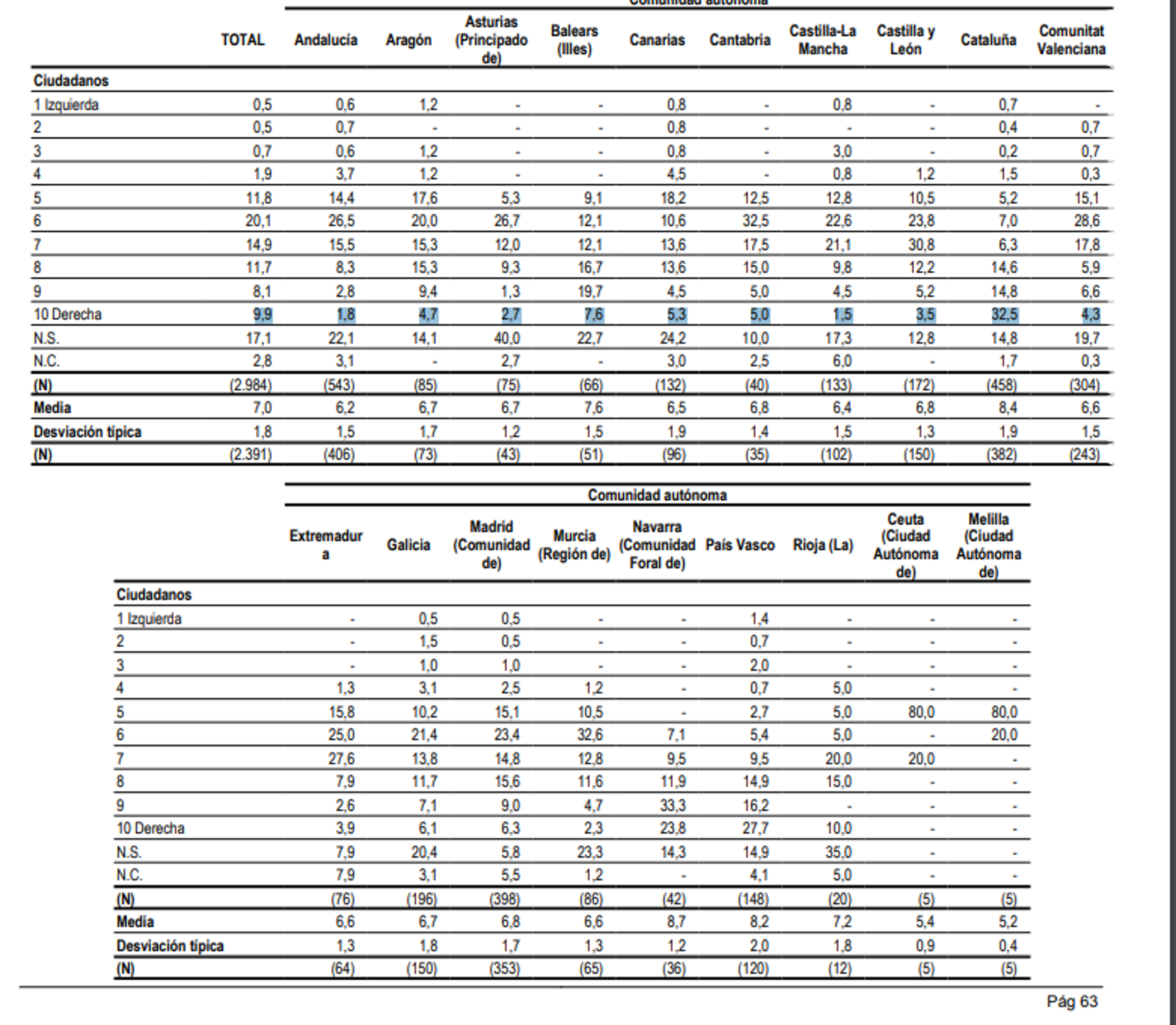 If the next three positions on the scale, 5-7, are indicative of a centre-right party, only 18.6% of Catalans place the Cs party there. The party's official discourse is that it is centrist.