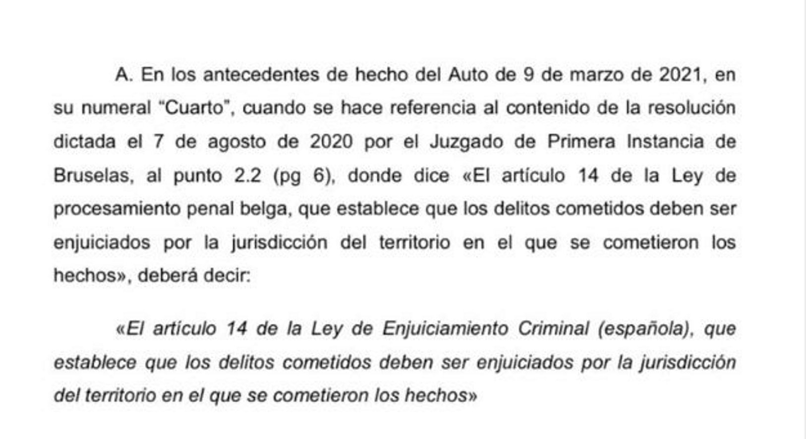 Specifically, it was noted that the translated text referred on two different occasions to Article 14 of the Belgian Law on Criminal Procedure, while the original actually referred to the Spanish Law on Criminal Procedure. This article is cited in the chapter on precedents and in the section on legal bases, and refers to the fact that crimes must be prosecuted in the territory where they occur.