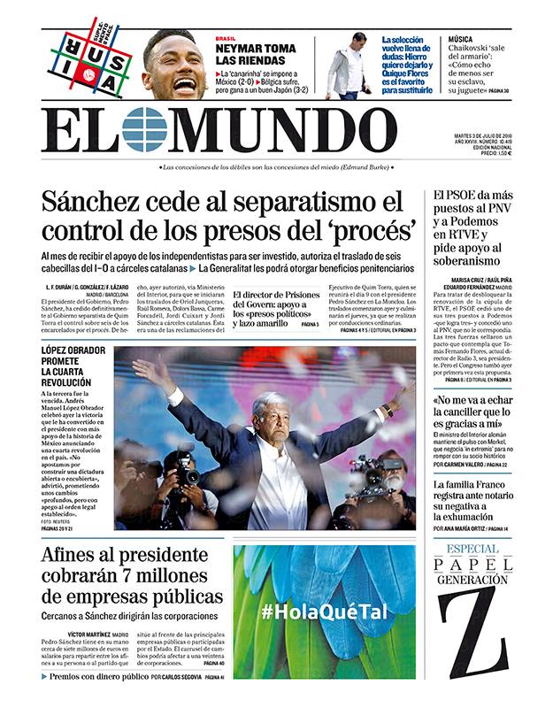 Massive frustration in the Spanish press in response to the transfer of the Catalan political prisoners to Catalan prisons. Most of the major Madrid newspapers are severely critical of Spanish prime minister Pedro Sánchez for "giving in to the blackmail" of the independence movement and moving the imprisoned politicians to Catalonia, even though the decision corresponds to a right that every remand prisoner has.