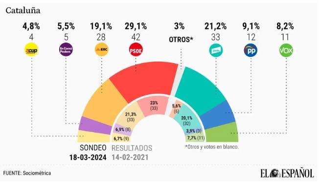 Salvador Illa's Socialists would be the leading force in Parliament, with 23.8% of the votes and 35-38 seats (currently 33) - which would represent a slight upward trend (one percent) compared to the 2021 election. In second place, Junts and ERC would tie at 29-32 deputies, but Carles Puigdemont's party would achieve a few more votes: 18.5%, compared to 18% of the Pere Aragonès candidacy. In the case of the Republicans, they would lose three percent of their support and up to four seats (currently, they have 33). As for the post-convergents, they would fall back by 1.3 points and up to three parliamentarians (they now have 32).