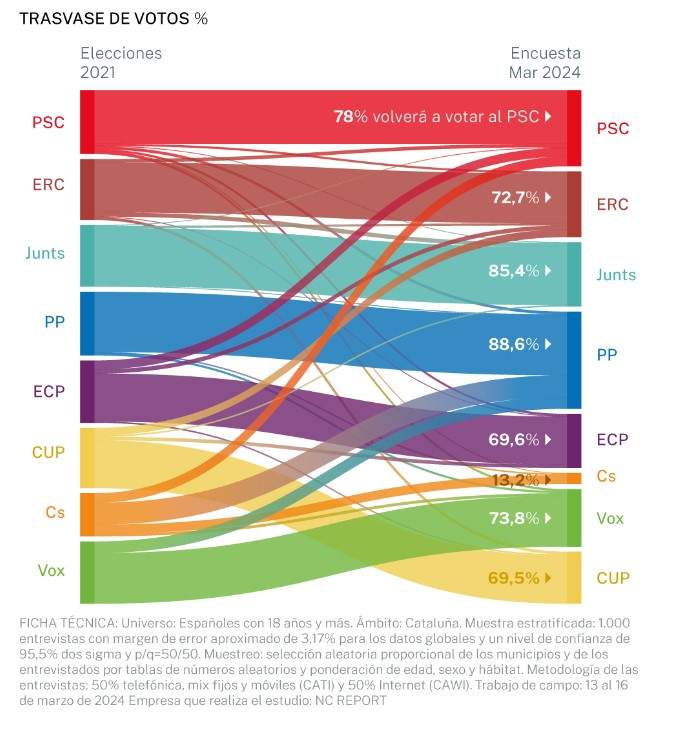 The biggest change in the Catalan lower house forecast in these two newspapers is the recovery of the People's Party (PP), rising spectacularly from its current three seats to 12-13 MPs. In other words, the Spanish conservatives would add around 10 MPs and become the fourth most voted force, surpassing Vox. However, the far-right party would only lose some of its strength in Catalonia in the election, falling from 11 seats to 9-10 representatives. The key to this is that the PP growth does not come from Vox voters, but from Ciudadanos (Cs). The party that was the largest party in Catalonia in the 2017 elections, and went into free fall in the years that followed, is currently engaged in study with the PP on some kind of electoral confluence between the two. Meanwhile, NC Report sees Cs as likely to lose most of the votes it won in 2021, the great bulk of them to the PP and other groups heading for the PSC and Vox. On their own, they are not predicted to win seats in Parliament. A far cry from 2017, when they won 37.