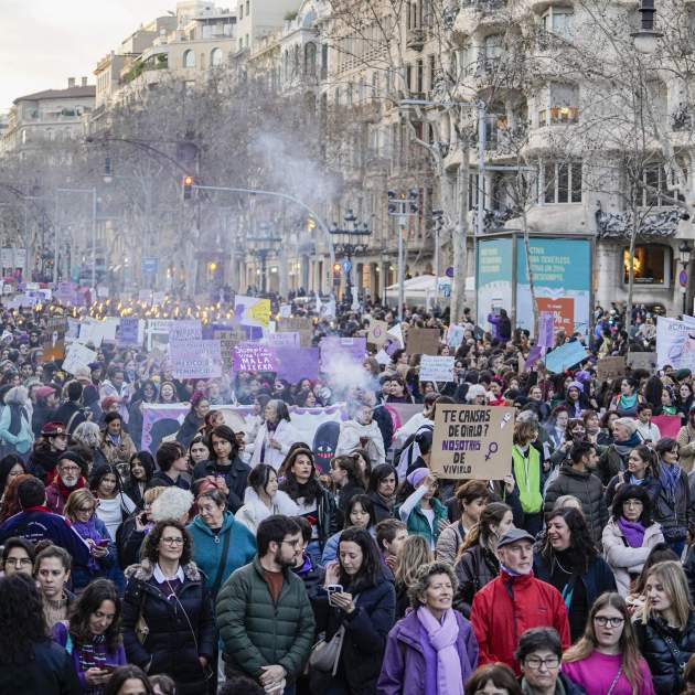 The eighth of March - "8-M" in Catalonia and Spain - and once again, women have filled the streets of central Barcelona to claim effective equality and to stand up to the sexism that is still present in our day-to-day life. Around 100,000 people according to the organization, 40,000 according to the Guàrdia Urbana, of all ages - but especially young people in a context where Generation Z males have tended to react against feminism and are increasingly turning towards the extreme right - filled the centre of the Catalan capital between the Jardinets de Gràcia and the Arc de Triomf with oodles of purple and plenty of protest banners. This year, the International Women's Day demonstration in Barcelona was marked by the war in Gaza, with a large number of Palestinian flags and messages of support for the women of the Gaza Strip. In fact, the slogan of the banner that headed the demonstration was "Together against marginalization, borders and genocide" and during the reading of the manifesto there were also references to the war.