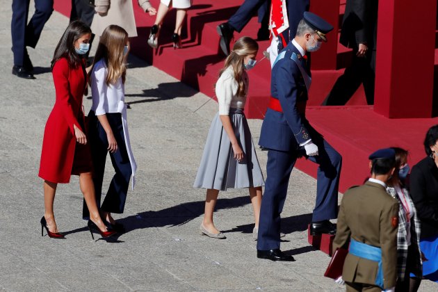 La premsa monàrquica s'explica "El vestido de doña Sofía es de la firma Carolina Herrera, que gusta mucho a la reina y a la que recurre en múltiples ocasiones. Lo ha combinado con uno de sus zapatos favoritos, unas bailarinas de punta en color azul marino, a juego con el vestido. El pelo suelto, con raya a un lado, y ondas suaves de medios a puntas. Además, ha lucido un suave y juvenil maquillaje en tonos rosas, con un toque de máscara de pestañas, iluminador en las mejillas y gloss en los labios" (ABC). Sofia no vesteix com vol però la seva mare sí llueix unes sabates de taló contràries a les recomanacions mèdiques, que li diuen que es quedarà coixa per les dues malalties que té a la planta del peu. I el greuge comparatiu que pateix la infanta és pitjor respecte la seva germana gran: Elionor sí va dur sabata amb tacó a l'edat que ara té la infanta Sofia. Així no, tothom sap que els greuges fan que un fill sigui el preferit. Malament Letícia. Quan Joan Carles va abdicar, Elionor va deixar de ser infanta per passar a princesa. I quan entrava a l'adolescència, Letícia baixava del burro: Elionor ja no era una nena. La princesa va poder lluir aquell 12-O de 2020 per primer cop en públic, sabates amb talons. Prou de ballarines planes. L'adolescent volia sentir-se no una nina sinó més gran. Sofia no ha tingut el mateix dret.