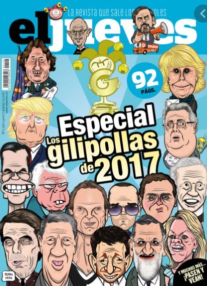 A banda de la pandèmia, representada pel símbol de la COVID dins la "O" de 'GILIPOLLAS', lloc d'honor pel rei fugat. Un Joan Carles amb crosses i vestit de caçador al qual han enxampat amb les mans plenes i que repudiat, no tornarà a Espanya per Nadal. Al seu costat, portant-li les maletes com els Botones dels hotels, dos vassalls com Pedro Sánchez i Pablo Iglesias. Però el Who is Who d'El Jueves ensorra també a la dreta: en primera filera, Santiago Abascal, Isabel Díaz Ayuso, Pablo Casado o Macarena Olona, amb la pertinent mascareta patriòtica.
