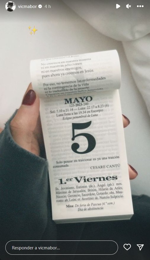 Atenció a les frases que tot just ensenya Victoria Federica a xarxes socials: "No creemos en nuestra miseria, ni en nuestras adicciones, ni en nuestros enemigos, pues ahora ya creemos en Jesús". Molt bé. Reconeixem que hi ha trampa, perquè no és el salm del 5 de maig, és el corresponent al dia anterior. Però l'atzar o la voluntat divina han volgut que la maquetació jugués les seves cartes, i au, sorpresa. Un altre element cridaner d'aquesta navalla multiusos temporal i espiritual és la frase del dia. És de Cesare Cantú, historiador i polític italià del segle XIX i autor de moltes cites cèlebres i pedagògiques. Segur que la Vic no el coneixia de res, però li ha deixat una frase sobre la que reflexionar, com si fos una galeta de la fortuna en un restaurant xinès: "Solo pensar en traicionar es una traición consumada".