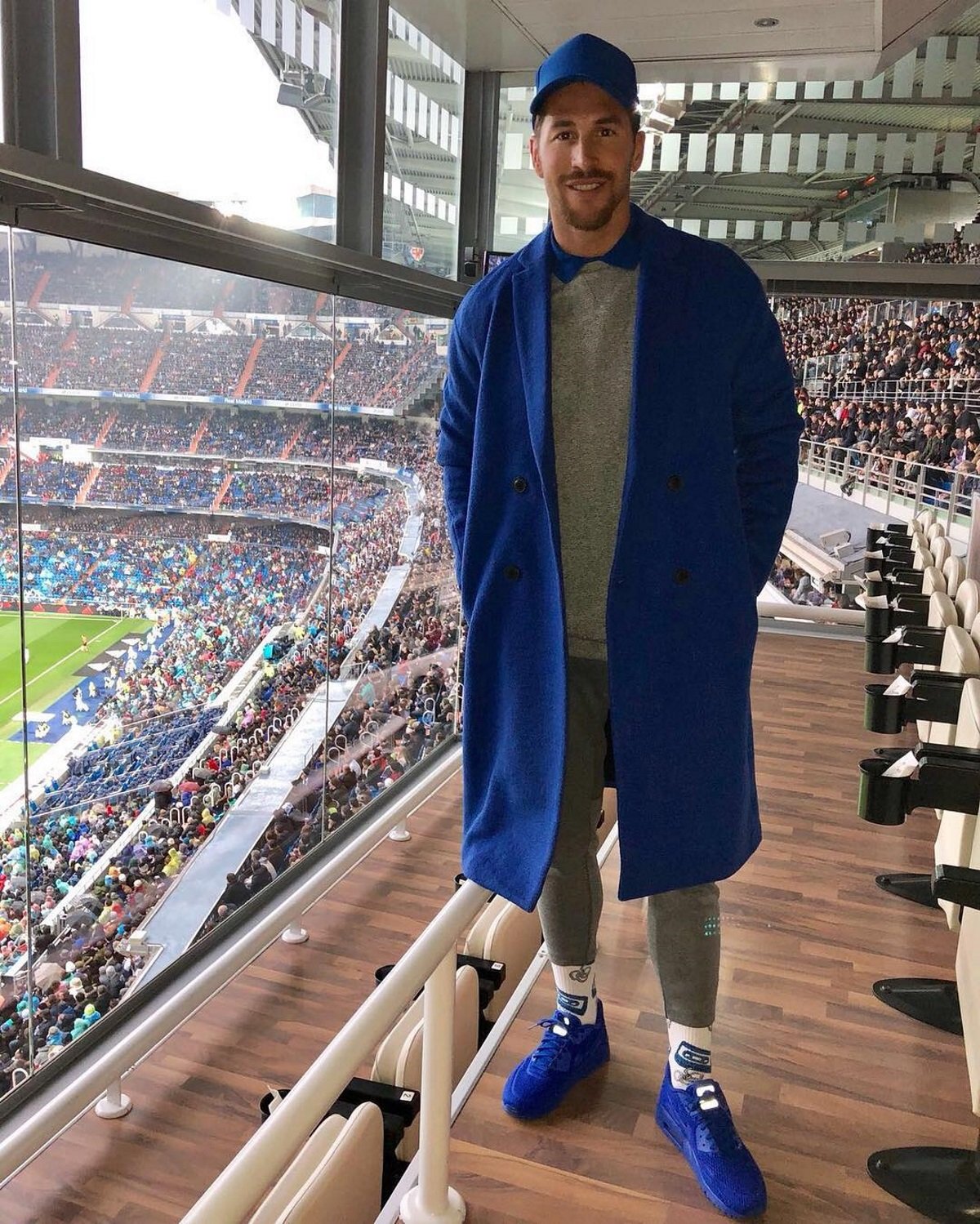 No obstant això, l’andalús ha volgut fer suport als seus companys des de l’Estadi Santiago Bernabéu en l’enfrontament que jugava el seu equip contra el Vila-real. El central ha aparegut amb un estrany look: gorra, coll, gavardina i vambes de color blau radioactiu, amb pantalons i jersei de color gris.