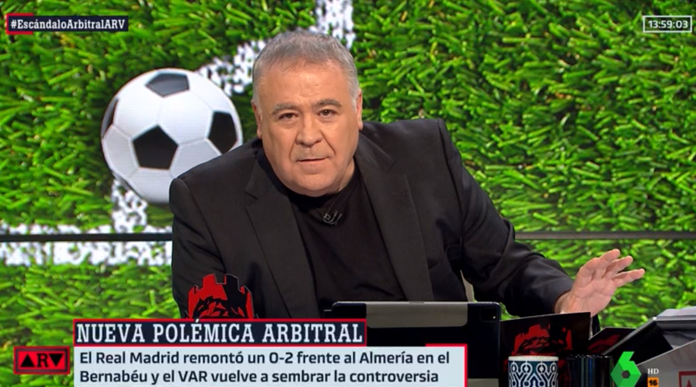 Antonio García Ferreras ha esclatat i ha tret la vena més merengona. El periodista, presentador i directiu de La Sexta no és només un campió del periodisme guardonat per la Guàrdia Civil, també consta com a exdirector de Comunicació del Reial Madrid i home de confiança del president blanc, Florentino Pérez. L'estima del mandatari va quedar reflectida en aquells famosos àudios, per a aquells que no estiguin gaire familiaritzats amb el tema. Un madridista pota negra amb un potent altaveu a les seves mans. Tot i que no acostuma a fer-lo servir en qüestions futbolístiques, sempre hi ha algun tema que acaba provocant que se salti l'autocensura i la contenció més elemental. Va passar amb Vinícius Jr., ha passat amb el cas Negreira i acaba de tornar a quedar clar a les 13:59 d'aquest dilluns 22 de gener, amb tot el món futbolero esgarrifat per l'atracament arbitral que es va produir al Santiago Bernabéu durant el Reial Madrid - Almeria.
