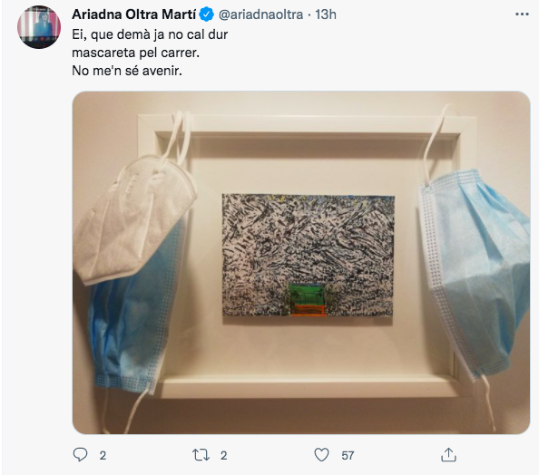 Faltaven pocs minuts per a les nou de la nit del dimecres 9 de febrer del 2022 quan Ariadna Oltra va sorprendre a molts, en el seu compte de Twitter, ensenyant un racó de casa seva i revelant, d'ara endavant, que farà amb les mascaretes. "Que demà ja no fa falta portar mascaretes pel carrer. Nom'en sé avenir", escriu la presentadora del programa de TV3, TN Matí, que fins fa poc ha estat de baixa després de patir una lesió a la cama en caure d'una bicicleta.