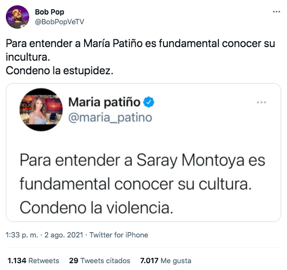 Unes paraules, per part de Patiño, que han aixecat un gran enrenou, com és normal. No només persones anónimes són les que s'han atrevit a contestar-la, sinó també cares conegudes. Bob Pop, per exemple, ha estat un d'ells. El de Madrid, que recentment ha estrenat la seva biografia, Maricón Perdido, al canal privat TNT, ha escrit el següent: