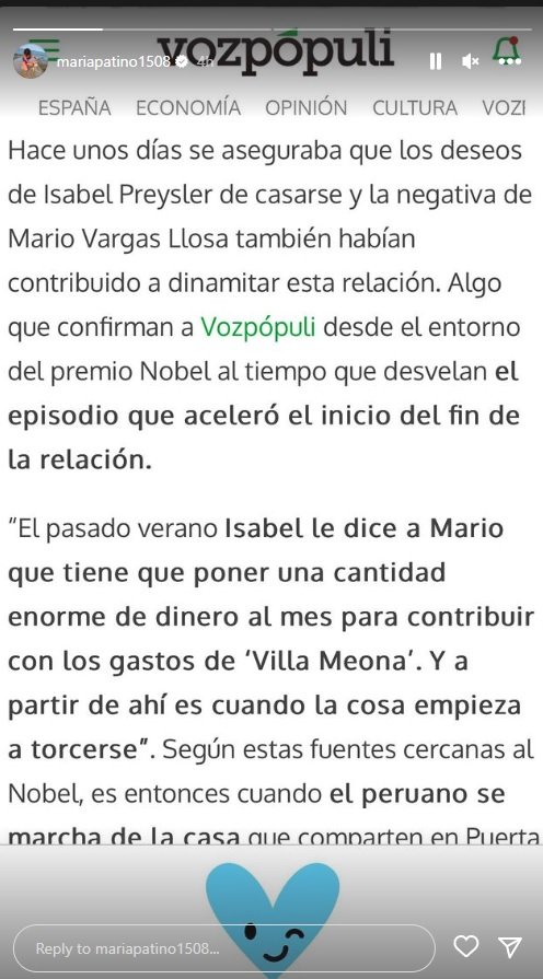 La separació de Mario Vargas Llosa i Isabel Preysler porta cua. El Premi Nobel és a punt de rebre un honor de les lletres franceses, amb el rei Joan Carles d'hipotètic convidat si la salut li ho permet, però Mario té por dels dimecres. És el dia que es publica el BOE de la Preysler, la revista Hola. I la filipina no ha desaprofitat l'ocasió per eclipsar el seu ex, carregant contra ell per un motiu: haver parlat contra la seva filla Tamara Preysler. La gallina protegeix els pollets i Mario contraatacarà. La guerra està servida. Però quin és el motiu real de la separació? S'ha parlat de la gelosia d'ell, que es veia eclipsat, de la frivolitat d'ella, que avorria l'escriptor. Però María Patiño, una de les millor informades de la capital, publica al seu Instagram la versió que li arriba a ella: tallen després d'una bronca pels diners.