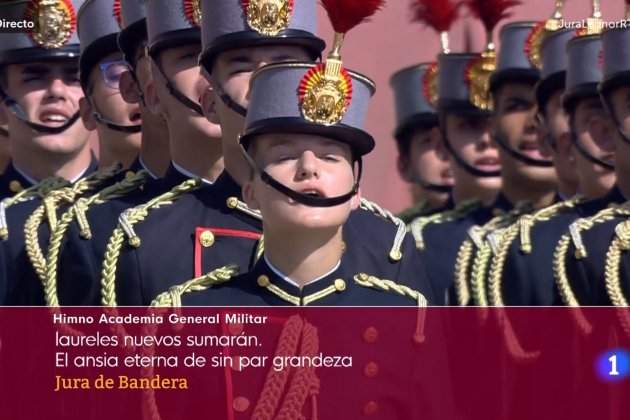 L'altre gest de tuf caspós i franquista ha arribat durant la cantada de l'himne de l'Acadèmia. Va ser compost l'any 1974, a les acaballes de l'existència del dictador, però no s'ha actualitzat en democràcia. Pa' qué. Felip VI, des de la tribuna presidencial i ben dret, i la seva filla princesa amb la mirada perduda, s'esgargamellaven amb la composició, que en la seva primera estrofa ja diu molt de quin tipus d'Espanya hem vist aquest matí de 2023: "Honor y Gloria de la Raza, tus cadetes España serán y a la grandeza de tu historia, laureles nuevos sumarán". La raça (espanyola) com a concepte. Quin fàstic.