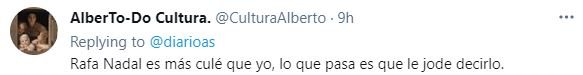 Quan al seu tiet i entrenador durant molts anys, Toni Nadal, li van preguntar a El intermedio per algun defecte del seu nebot, va respondre sorneguer: "Te diría uno, pero no lo voy a decir... Es futbolístico". També li van preguntar què li agradaria fer a Rafa quan pengi la raqueta: "Supongo que una culminación suya sería ser directivo del Real Madrid. Sería la culminación de su carrera deportiva". Fins aquí arriba la passió pel conjunt blanc d'un Nadal que viu envoltat d'una família declaradament culer. I no només per Toni Nadal. Un altre dels seus tiets, el gran Miquel Àngel, va vestir durant 8 temporades la samarreta blaugrana, com és sabut per tots.