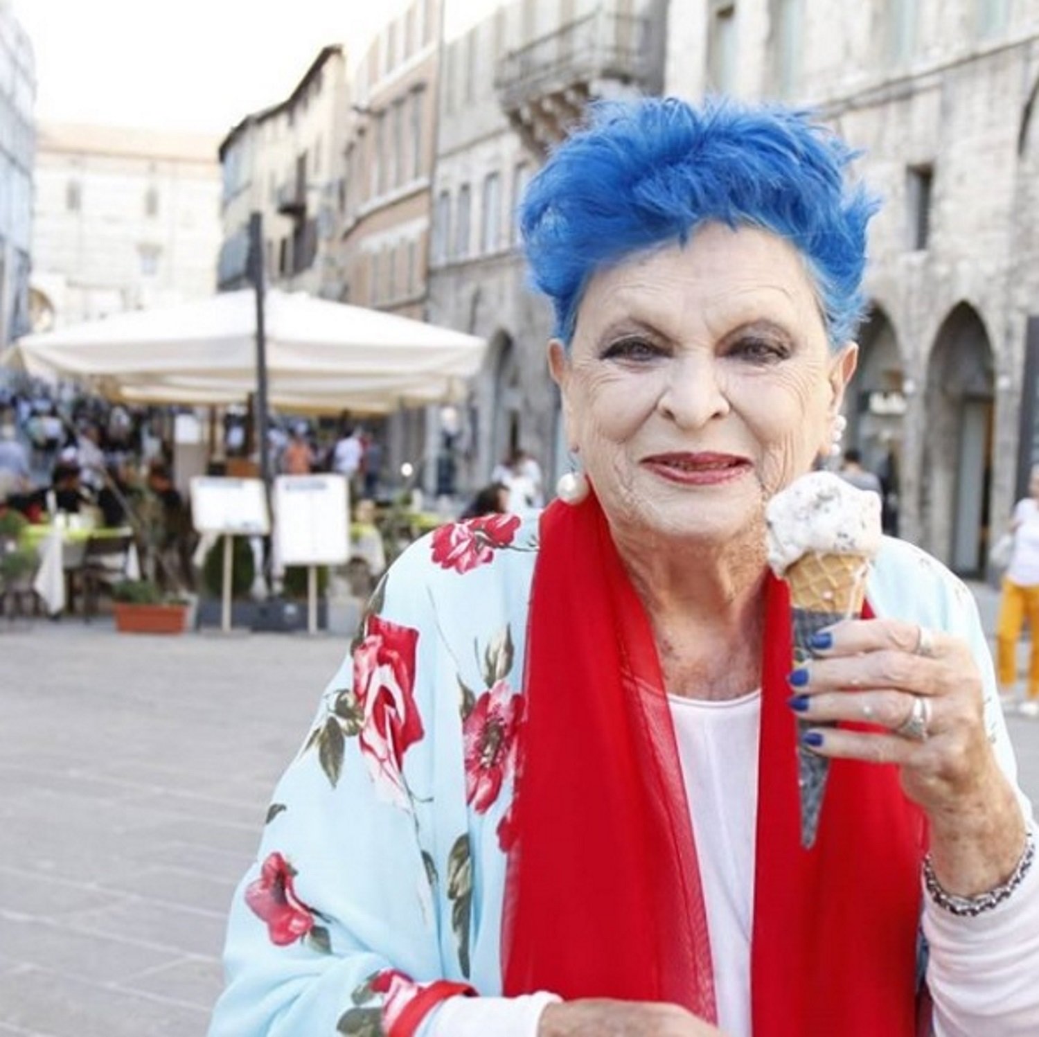 Lucia Bosé porta un barret. Si no, veuríem com els seus cabells canvien de color. De blau elèctric a vermell intens, enfadada com un dimoni.