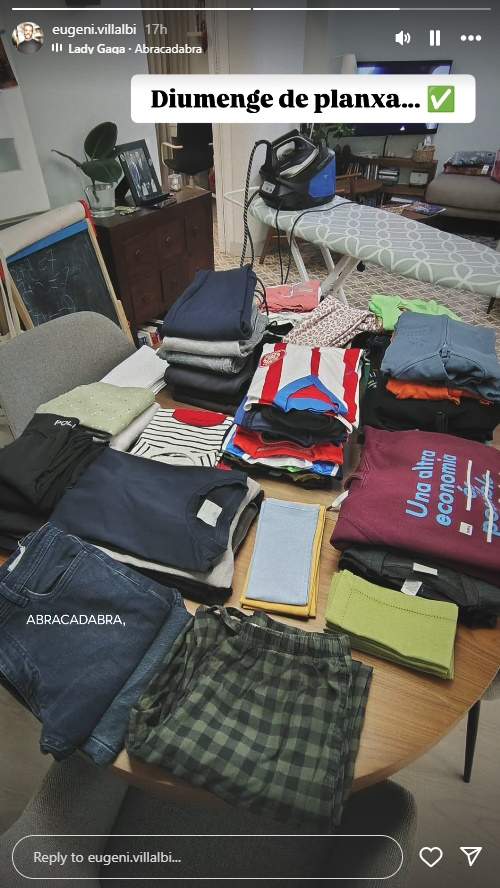 Cruanyes apareix sol saludant Joel Joan al camerino, sense el seu inseparable Eugeni Villalbí, el seu company des de fa anys, el marit i pare de les dues criatures, Elies i Joana. Són discrets en les sortides conjuntes però tots dos comptes d'Instagram fan patxoca. El cap de setmana a casa del líder d'audiència de Catalunya, la persona que cada dia concentra més espectadors davant la tele, és així. Dissabte al teatre i diumenge planxa. A casa acostuma a planxar la bugada de quatre, un cove ple de roba, l'exdiputat Eugeni. I la foto de diumenge a la tarda és tan poc estilosa, tan humana, tan tendra, que és molt millor que el glamur de Joel Joan. Atenció als detalls del quarto de planxar de Cruanyes-Villalbí: foto del matrimoni, tal vegada del dia del casament, pantalons de pijama de quadres i samarreta del Girona CF. A casa són del Barça però també del Girona, sembla ser. I una mania: planxa fins i tot les estovalles, o les fundes de coixí. Polits fins a dir prou: