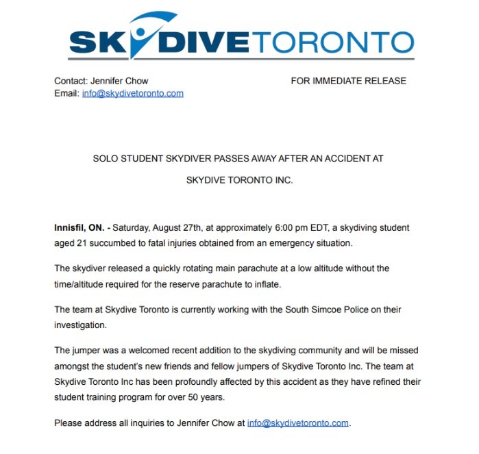 Des de la companyia han informat dels fets explicant què pot haver passat: "Va deixar anar un paracaigudes principal de rotació ràpida a baixa altura, sense el temps o l'actitud necessaris perquè el paracaigudes de reserva s'inflés". Des de l'empresa de paracaigudisme han emès un comunicat expressant el seu condol i justificant que mai no havien tingut un incident fatal com el de Pardazi: “La saltadora era una incorporació recent a la comunitat de paracaigudistes i la trobarà a faltar entre els nous amics de l'estudiant i els companys de Skydive Toronto Inc. L'equip de Skydive Toronto Inc s'ha vist profundament afectat per aquest accident, ja que han perfeccionat el programa de formació d'estudiants durant més de 50 anys”. El cercle íntim de la difunta, però, clama justícia i considera que abans de fer un salt en solitari per primer cop, s'hauria d'haver dut a terme fer un dia de pràctica en terra ferma abans que res, cosa que neguen que s'hagués produït amb la Tanya.
