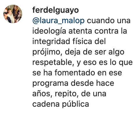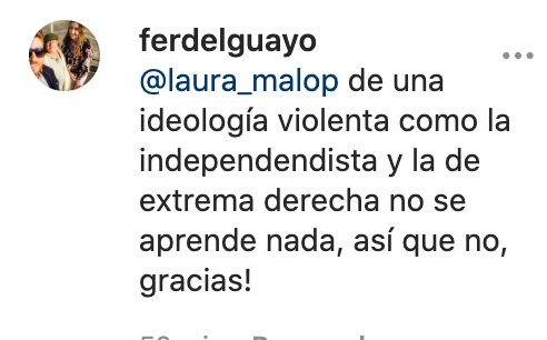 - laura_malop: @ferdelguayo es posible que haya gente con ideología independentista, y es seguro que habrá gente de todas las ideologías. Y sabes que? Que de todas se aprende. Y seguro que se tratan desde el respeto y que primará la persona antes que su ideología política.