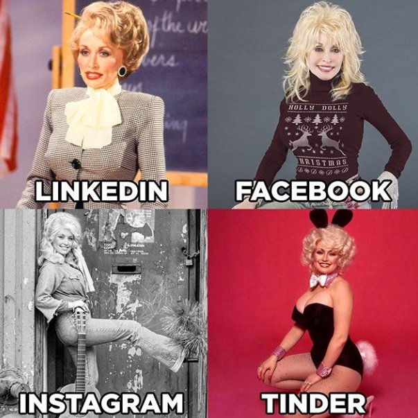 Qui li anava a dir a Dolly Parton que esdevindria un referent mundial a les xarxes. Però la cantant s'ha convertit en el repte viral del moment. "Troba una dona que pugui fer-ho tot", escrivia Parton a l'hora que publicava quatre fotografies d'ella mateixa recreant els diferents perfils de quatre xarxes socials: LinkedIn, Facebook, Instagram i Tinder. Quatre imatges diferents d'ella mateixa que ara estan copiant massivament molts famosos. Una foto més seriosa, la de LinkedIn, per trobar feina; una de més familiar per Facebook; una de postureo per Instagram i la del posat més seductor per Tinder de cara a trobar un match eròtico-festiu.