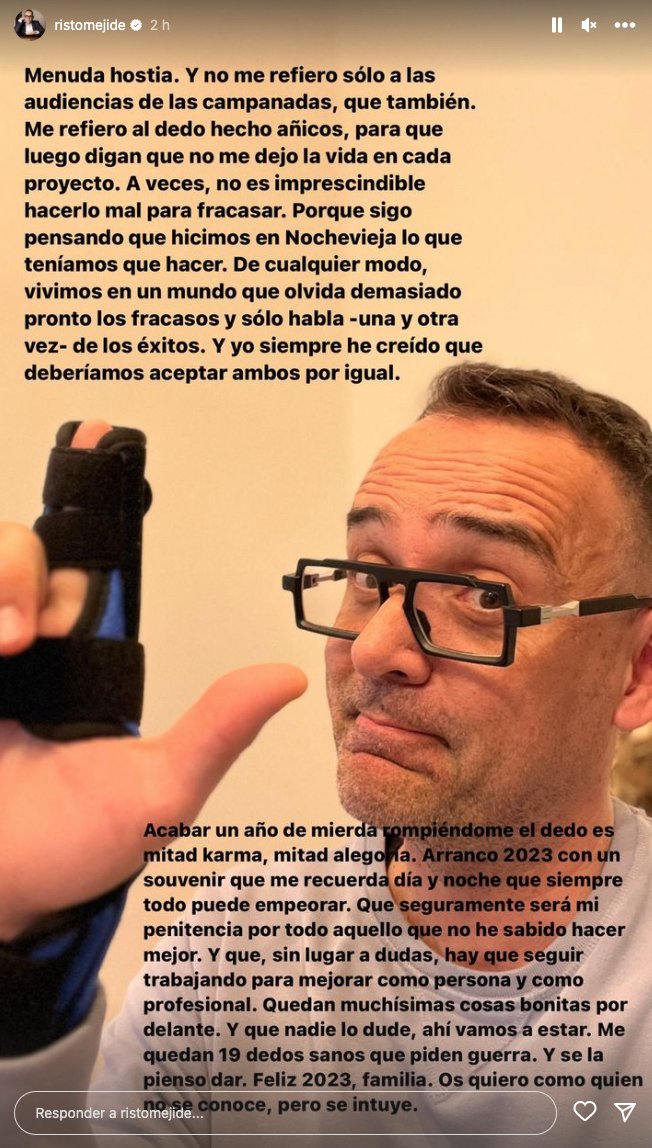 Ves a saber si el karma ha tingut alguna cosa a veure, però 2023 ha començat fatal per al publicista i presentador. Fins i tot ho reconeix. I no només per obtenir un pobríssim 6'5% (Telecinco) i 1'6% (Cuatro) a tot l'Estat, i que acredita el fiasco en la inversió de 40.000€ en la contractació dels presentadors de la nit. També ha patit un mal físic: s'ha trencat un dit de la mà. En català diem "tenir la mà trencada" quan fas alguna cosa molt bé, que tens traça. Potser per això ell només es va trencar una falange. Sense segones intencions, clar. Això sí, ell ho ven d'una altra manera: "Para que luego me digan que no me dejo la vida en cada proyecto", escriu al costat d'una imatge en la que ensenya la seva extremitat malmesa, amb el dit inserit en una fèrula. "Acabar un año de mierda rompiéndome el dedo es mitad karma mitad alegoria. Arranco 2023 con un souvenir que me recuerda día y noche que todo puede empeorar". Va sortir de la retransmissió directe a l'hospital, ara li esperen 19 dies de recuperació,