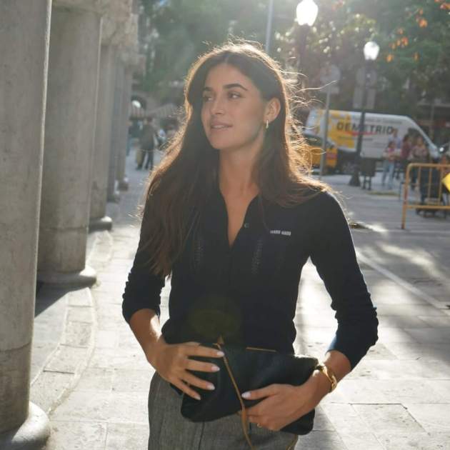 Les fotos protagonistes de la publicació són, sens dubte, les d'ella passejant per Barcelona amb un look compost per un jersei blau fosc amb botons, uns pantalons de pinça de quadres, una bossa de mà negra amb tocs daurats a conjunt de la resta d'accessoris. Senzill, elegant, i que, com podreu veure, a Sira Martínez li queda d'allò més bé: