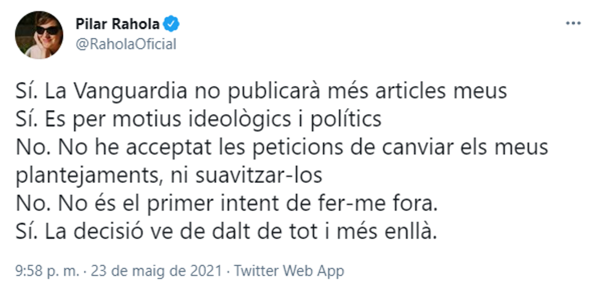 En un tuit, la periodista ha confirmat que el rotatiu ja no publicarà més articles seus i ha remarcat que la decisió s'ha pres per "motius ideològics i polítics". "Sí. La Vanguardia no publicarà més articles meus. Sí. És per motius ideològics i polítics. No. No he acceptat les peticions de canviar els meus plantejaments, ni suavitzar-los. No. No és el primer intent de fer-me fora. Sí. La decisió ve de dalt de tot i més enllà", ha escrit a Twitter.