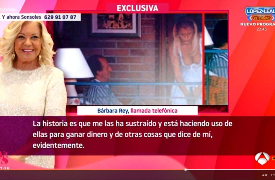 Bárbara Rey en el programa Y ahora Sonsoles: "Estoy mal. Hace un año que no levanto cabeza con mi psiquiatra y mi psicóloga, desde que mi hijo me traicionó. No he dicho nunca esto: vendiendo estas fotos queda claro cómo es este chico (mi hijo). Me sustrajo material personal mío pero nunca pensé que llegaría a este extremo tan exagerado. Él no ha hecho esas fotos, nunca. Me las ha sustraído y gana dinero con ellas. Las fotos no diré quién las hizo, fue una persona muy cercana a mí que no está ya en este mundo. Que yo sepa no hay más fotografías". Alguien hizo que se hicieran estas fotos y todo indica que fue la misma Bárbara Rey, que guardó las imágenes por si tenía que hacer chantaje al rey. Antena 3 debate si hay otros vídeos, tórridos, de carácter sexual, entre el rey y la vedette. Bárbara Rey no lo reconoce.