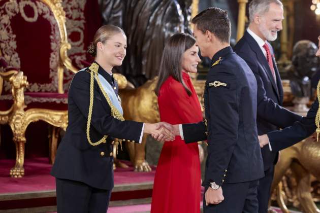 El año 2023, los verdaderos protagonistas del besamanos fueron los últimos de la cola. Leonor sonreía tímidamente al darles la mano, y ante la evidencia también lo hicieron Felipe y Letizia. Es por eso, que este año, todo el mundo estaba pendiente si la volvíamos a ver tan cómplice. El tiempo no ha acompañado a que los reyes y los invitados tengan una buena cara durante el día, pero, al final de la larga cola de entidades para saludar, han pasado a algunos de los compañeros de Leonor, y las imágenes hablan por sí solas. La princesa de Asturias volvía a sonreír con complicidad con los cuatro últimos chicos que pasaban por el besamanos. Luciendo el mismo uniforme de la Escuela Naval de Marín, se notaba que habían salido de farra con la royal cuando Leonor no podía evitar sonreír, especialmente con el segundo de estos, con quien no ha podido evitar sacarle el ojo de encima, incluso antes de su turno.