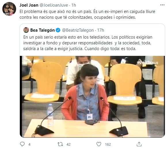 El actor y director teatral ha retuiteado el comentario de Talegón y le ha negado la mayor sobre el punto donde la periodista tilda a España de "país", en este caso, poco serio, por no decir una palabra más gruesa. Joan, sin embargo, no se ha mordido la lengua y ha redondeado la denuncia pública con una de las definiciones más demoledoras que se le recuerdan sobre esta España a quien algunos consideran un país. El intérprete niega que sea ningún país. ¿Qué es, entonces, para él?: "Un ex-imperio en caída libre contra las naciones que tiene colonizadas, ocupadas y oprimidas". Más claro, el agua.