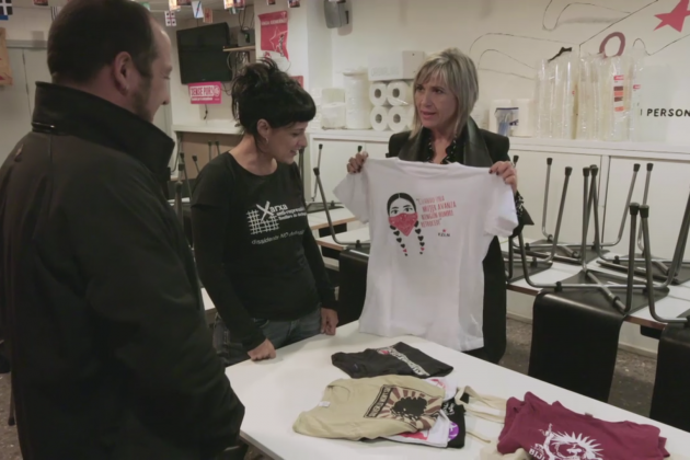 Hacia el final del programa, la diputada de la CUP y la periodista llegan, junto al exdiputado David Fernàndez, a un casal independentista de Sants, donde los cupaires enseñan a Otero algunas de las camisetas marca de la casa con qué a menudo visten.