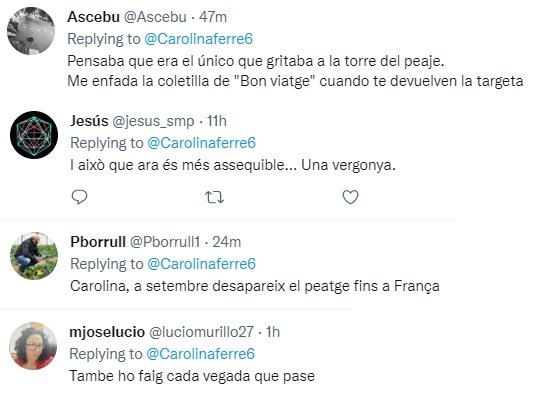 ¿Con quién? Más bien con qué. Con unos inventos del diablo destinados a sacar pasta a mansalva de los contribuyentes. Evidentemente, hablamos de los peajes. ¿Y qué hace siempre siempre siempre Carolina Ferre cuando pasa?: "Nunca había gritado LADRONES tan seguido al pasar por los peajes...". Un LADRONES en mayúscula y gritado muy fuerte. Y no sólo chilla: "Una costumbre que tengo al bajar la ventana para pagar. Y pitar. ¿También lo hacéis?". Ferre gritando y pitando la bocina. La entendemos perfectamente.