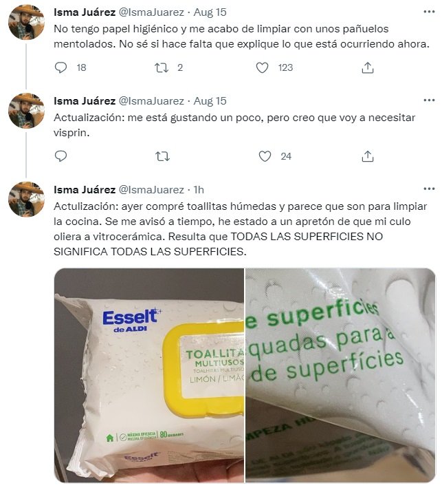 Después de improvisar con pañuelitos mentolados, también compró "toallitas húmedas" que le han servido para hacer una curiosa y necesaria reflexión, un aviso a navegantes para los que les pase por la cabeza hacer un uso determinado...: "Parece que son para limpiar la cocina. Se me avisó a tiempo, he estado a un apretón de que mi culo oliera a vitrocerámica. Resulta que TODAS LAS SUPERFICIES NO SIGNIFICA TODAS LAS SUPERFICIES".