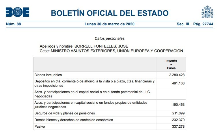 La ley obliga a hacer público el patrimonio de los altos cargos del Estado cuando entran y cuando salen de la Administración. Esta semana el BOE ha publicado cuánto dinero tiene el exministro de Asuntos Exteriores Josep Borrell. Se puede consultar aquí.