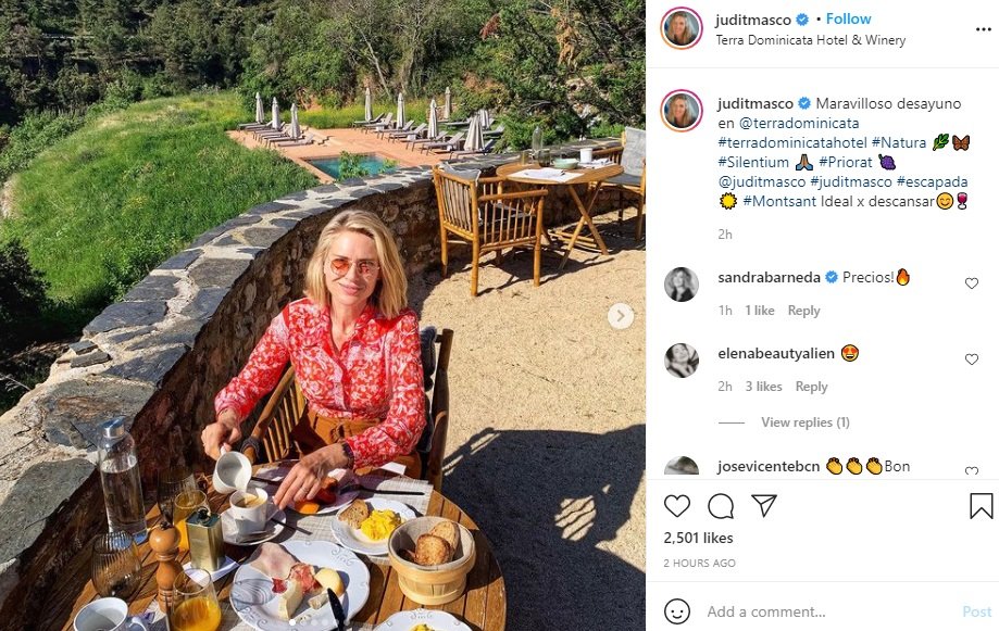 Un lugar ideal para el relax, en Scala Dei, en el término municipal de la Morera de Montsant, donde, directamente, Judit Mascó se ha puesto las botas. Un desayuno de traca, donde no falta de nada: tostaditas, embutidos, zumo de naranja, café, huevos revueltos y pan con tomate. Lo mejor no es sólo el festín gastronómico, que también, sino qué tiene en frente la modelo mientras se lo come. Miren y contemplen: