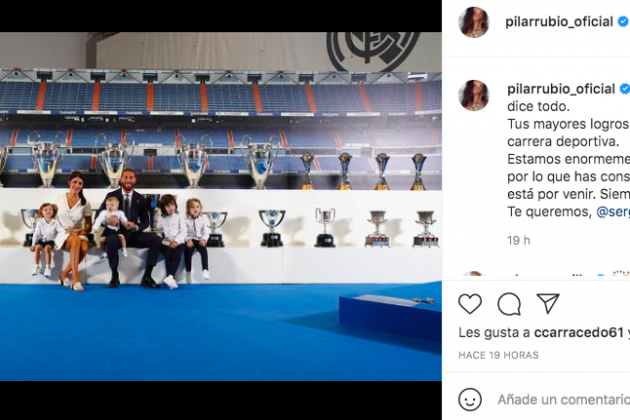 "Estamos enormemente orgullosos de ti, por lo que has conseguido y por lo que está por venir", escribe, entre otras cosas, Pilar Rubio en su cuenta de Instagram, en la fotografía que ha compartido en las últimas horas de la despedida de Ramos del Real Madrid. Una foto en la que ella y el jugador, aparecen junto a sus cuatro hijos rodeados por todos los trofeos que ha ganado el equipo blanco. Foto: