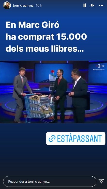 El tira y afloja humorístico, también llamado cortejo televisivo, es ya un género propio en TV3 del que disfrutamos en el 'Está Passant' de Toni Soler. La imaginación y ocurrencias de Giró son infinitas, y la última locura siempre está por llegar y superar el anterior. No podía dejar pasar la oportunidad de meter baza ante el hito de su comunicador y persona favorita, y por eso se ha presentado en Sant Joan Despí con una carro de supermercado lleno a tope de los libros que asegura haber comprado. El encuentro entre ambas estrellas de la casa prometía.