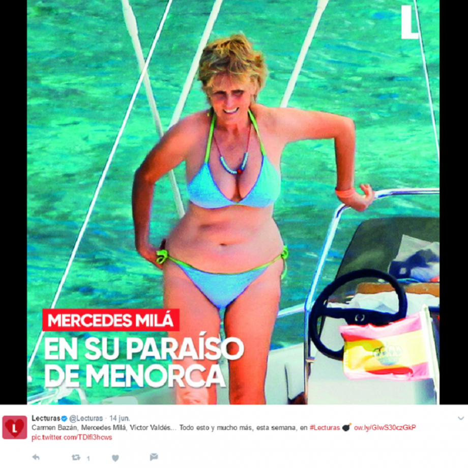A sus 66 años, ha sido pillada por los fotógrafos luciendo cuerpo con un bikini azul cielo con las tiras amarillo fluorescentes. La revista Lecturas ha publicado la instantánea en portada, alabando que muestre su figura sin complejos. Y es que el conjunto no esconde sus curvas: