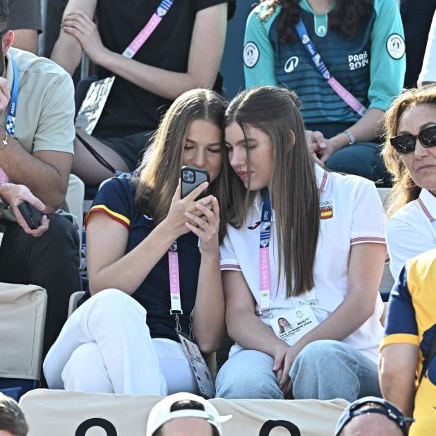Leonor y Sofía hicieron bien su único trabajo, sonrisa en la cámara con todos los jugadores, pero también tuvieron momentos en la grada donde pudimos comprobar su complicidad de hermanas. La princesa de Asturias, a punto de cumplir 19 años, y la infanta Sofía, con los 17, recién cumplidos, las dos tienen edad para hacer TikTok, hacerse selfies y publicar los momentos con amigos. Por eso, entre los centenares de fotos que los paparazzi han hecho a las hijas del rey, la red se ha quedado conquistada por una única foto. Leonor y Sofía haciéndose un selfie en la grada con una de las formas más habituales que lo hace toda la juventud: con la cámara de atrás y el formato 0,5, unas auténticas teenagers. Podemos ver que se hacen la foto con el móvil de la Princesa de Asturias, donde podemos observar un pequeño detalle, tiene el cristal protector hecho polvo.