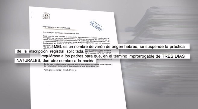 Si no lo hacían, pondrían uno de oficio. Les propusieron Melissa o Amèlia, pero los padres se negaron y recurrieron la decisión. "Me acababa de quitar la identidad de la niña. Le cambió el nombre y ¿ahora yo tengo que darle una nueva identidad? Fui al juzgado y si lo llego a encontrar, me lo como.", recuerda entre lágrimas la madre. Recurrieron la decisión, pero provisionalmente le tuvieron que poner el nombre de Adela, aunque ellos alegaron que, según el Instituto de Estadística de Catalunya, hay más de 125 mujeres inscritas en los registros civiles del país con el nombre de Mel. "En catalán es femenino y, por lo tanto, no es un nombre extraño. Es un nombre correcto.", dicen desde el IEC, tal como informó el Telenotícies de TV3.