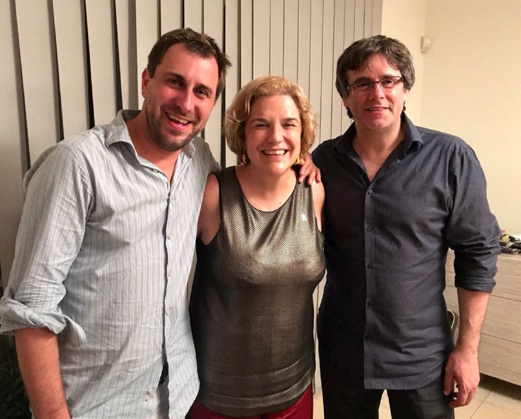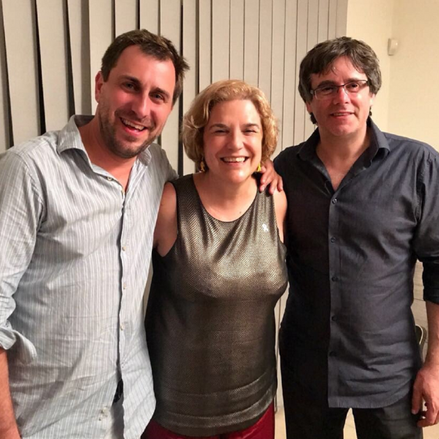 En los últimos días el opinador Toni Bolaño dio por hecho que Carles Puigdemont ha pedido a Pilar Rahola que encabece la lista electoral de Barcelona para su partido. El desmentido no ha sido publicado por su diario. Con la foto de ahora podrán volver a especular. Pilar lleva lazos amarillos por los tres: en las orejas y el corazón. Las redes solo ven a tres amigos sonrientes, contentos de reencontrarse.