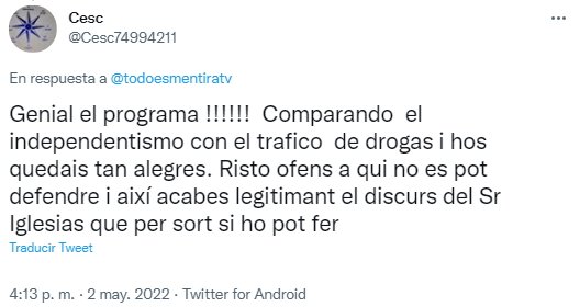 Naranjo: "¿Qué diferencia hay entre un capo de la droga y un capo independentista?". Así, sin vaselina. Todo en orden, comparando a traficantes con líderes de un movimiento tan pacífico como digno. La frase es tan infecta que hace daño, pero vaya, que viniendo de dónde viene, qué podríamos esperar. La red ha tomado la iniciativa, viendo la inacción del presentador del programa.