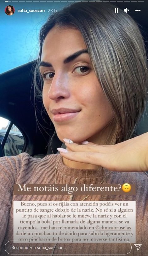 Un cambio en el pelo que se suma al que se ha hecho en la cara. Y es que Sofía Suescun también ha aprovechado para pasar por su clínica estética de confianza para terminar con uno de sus mayores complejos faciales. La ex de Telecinco, según ha contado, movía mucho la nariz cuando hablaba. Algo que no le gustaba para nada, hasta el punto de obsesionarse con ello. Motivo por el que ahora ha decidido inmovilizarse la nariz para que cuando hable no se le mueva. ¿Cómo lo ha hecho? Pues ella misma lo ha contado en su cuenta de Instagram.