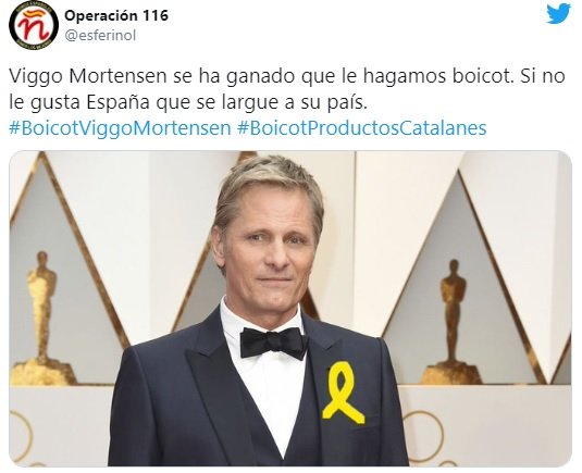 Viggo Mortensen es uno de los mejores actores del mundo, y es socio de Òmnium cultural desde mayo de 2018. Esta combinación ha hecho enloquecer la prensa radical unionista. El diario El Mundo ha publicado una columna insultante contra la estrella del cine por estar aparejado con la actriz catalana Ariadna Gil, ser yerno del abogado indepe AugustoGil Matamala y pagar la cuota de la entidad soberanista que preside Jordi Cuixart. Y lo ponen a parir por una falsedad: afirman que llevó un pin de lazo amarillo a la ceremonia de los Goya de hace unos días: