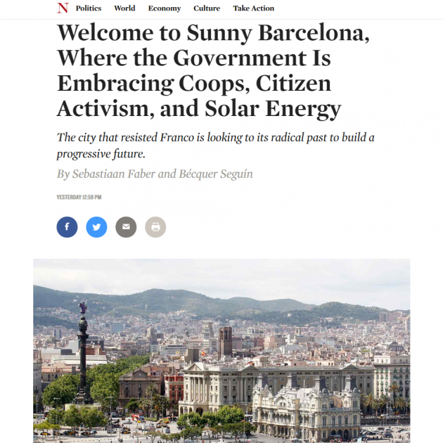 "Bienvenidos a la soleada Barcelona, donde el gobierno abraza a las cooperativas, el activismo ciudadano y la energía solar". Este es el titular de un artículo sobre la alcaldesa de Barcelona, Ada Colau, y sobre su equipo de gobierno, en la revista norteamericana The Nation, de mirada política progresista.