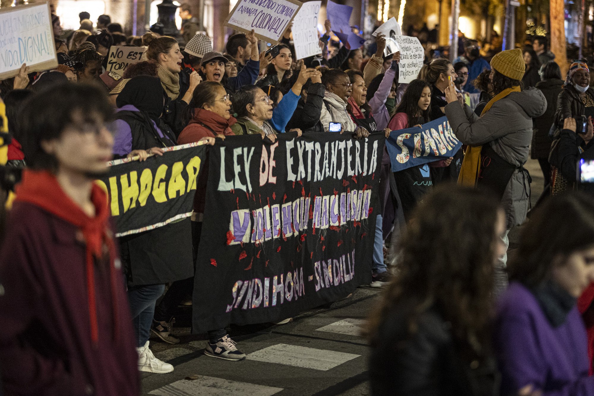 Lectura del manifiesto en lo alto del camión con la participación de: Isabel (madre protectora), Dolo Pulido (Noviembre Feminista, Ca la dona y sindicalista), Lucie Foissin Massey (psicóloga feminista), Lorena Garrido (Grupo Antígona UAB) y Paula Santos ( Mujeres Migrantes Diversas). / Foto: Montse Giralt