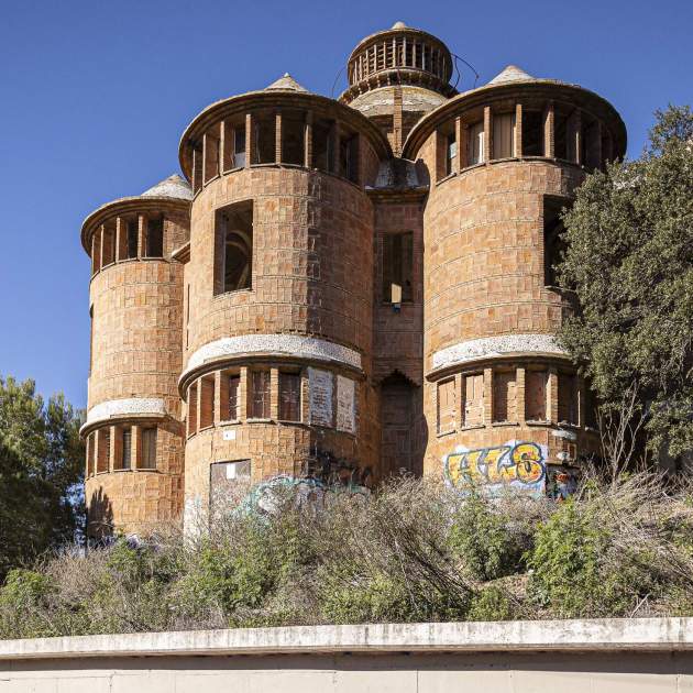 Efectivamente, en la calle Júpiter, número 7, entre casas aisladas y terrenos sin urbanizar, aparece de repente una extraña construcción circular de obra vista, rematada con una gran cúpula rodeada de ocho cúpulas más. Es lo que queda de lo que debía ser la lavandería del Sanatorio Antituberculoso y responde a un proyecto del arquitecto Joan Rubió i Bellver, discípulo y colaborador de Antoni Gaudí. Obras de Rubió i Bellver en Barcelona son, por ejemplo, la Casa Golferichs, en la Gran Via; la Residència d’Estudiants de l’Escola Industrial y una de las construcciones más fotografiadas de la ciudad, el puente neogótico de la calle del Bisbe.