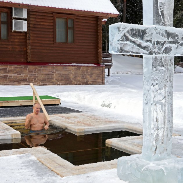 La escenografía es difícilmente mejorable: una piscina en forma de cruz rodeada de nieve y hielo, otra cruz de dos metros hecha de hielo delante de la piscina y el presidente Putin zambulléndose en las gélidas aguas hasta tres veces después de santiguarse.