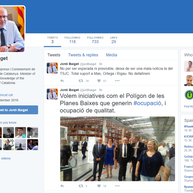 El conseller de Empresa i Coneixement del Govern de la Generalitat, Jordi Baiget, ha estrenado cuenta este jueves en la popular red social Twitter. El también exsecretario del Govern se presenta en su perfil en catalán y en inglés. En esta lengua lo hace como "Minister of Business and Knowledge of the Government of Catalonia", con clara vocación de dar un perfil global a la conselleria. ¿Motivará esta carta de presentación de Baiget como "ministro" catalán una intervención diplomática del ministerio de García-Margallo?