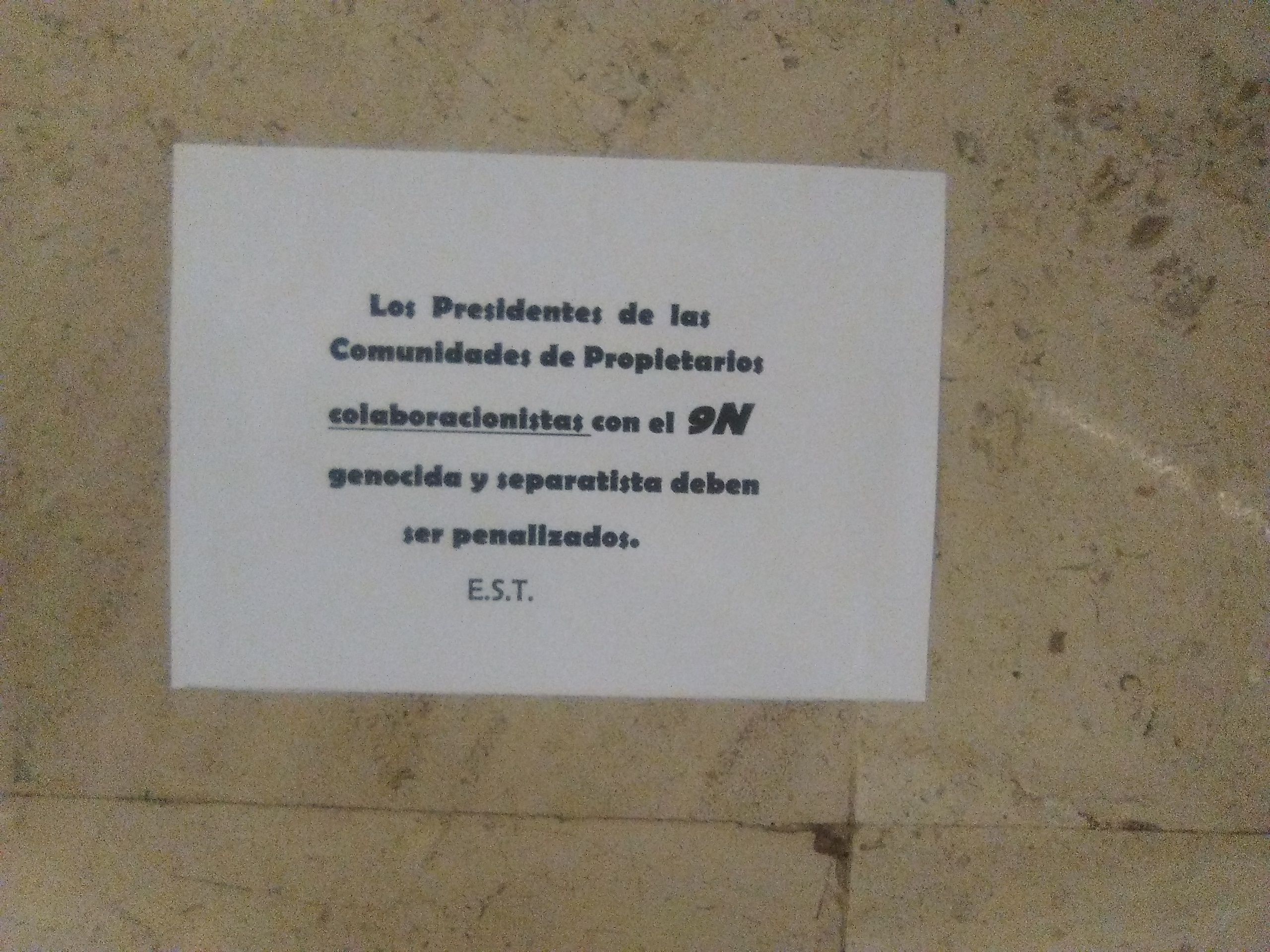 Curioso cartel aparecido estos días en el Metro de Barcelona, donde un grupúsculo que responde a las siglas E.S.T. acusa directamente a los presidentes de las comunidades de propietarios de ser "colaboracionistas" con el 9N, un movimiento que tildan de "genocida y separatista" y por el cual piden penalizar los esforzados vecinos que al menos durante un año aceptan ocuparse de problemas como el estado de las cañerías, la pintura de la portería, la suciedad en los rellanos y el buen funcionamiento del ascensor. Todo ello, evidentes prácticas secesionistas. Será porque lo hacen sin cobrar.