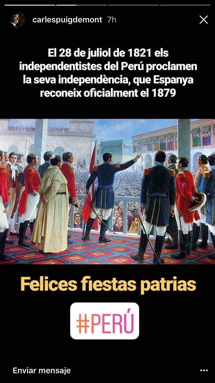 Hoy, sin embargo, uno de sus Stories se puede interpretar en clave futura ya que Puigdemont ha puesto énfasis en la independencia del Perú. Bajo el texto: "El 28 de julio de 1821 los independentistas del Perú proclaman su independencia", Puigdemont ha felicitado la Fiesta Patria a los peruanos y a las peruanas y ha acabado el mensaje acordándose del Estado español, "España reconoció Perú de forma oficial en 1879".