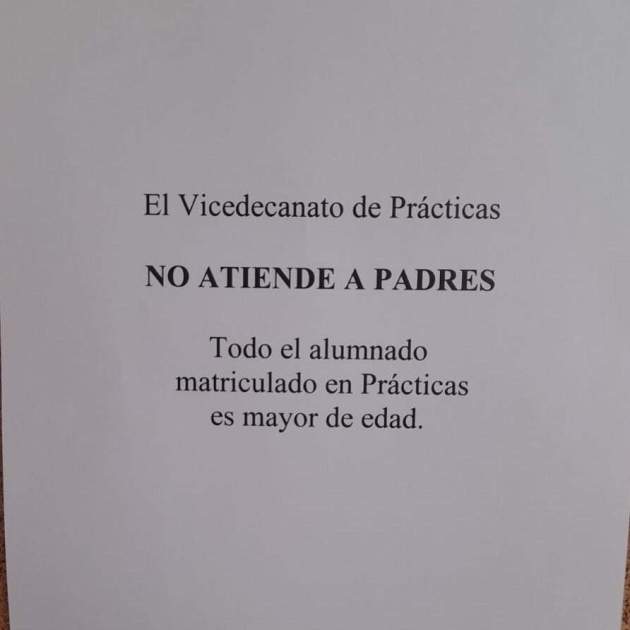 Gran revuelo el que se ha montado en las redes sociales después de que la Facultad de Educación de la Universidad de Granada (UGR) colgara un cartel informando de que el Vicedecanato de Prácticas "no atiende a los padres". Hartos de que los padres de los alumnos vayan a preguntar o, incluso, a pedir explicaciones, los responsables del área de prácticas de la UGR han pedido que no vayan más, ya que "todo el alumnado matriculado en prácticas es mayor de edad".
