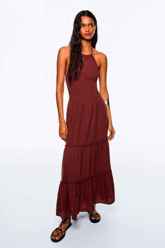 El vestido midi de Bershka con cuello halter y volantes es una prenda que combina elegancia y modernidad, ideal para diversas ocasiones. Su diseño cuidadosamente elaborado y la selección de materiales de calidad lo convierten en una opción destacada para quienes buscan estilo y comodidad en una sola pieza.
